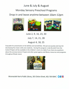 Enjoyable for preschoolers of all abilities and sensibilities. We put out puzzles and toys for developing fine motor skills and creativity. During this program Linda Brunetti from the Autism Project will be available in the children’s room at a table if you have any questions about the services Autism Project and other great agency and library resources and programs throughout Rhode Island.