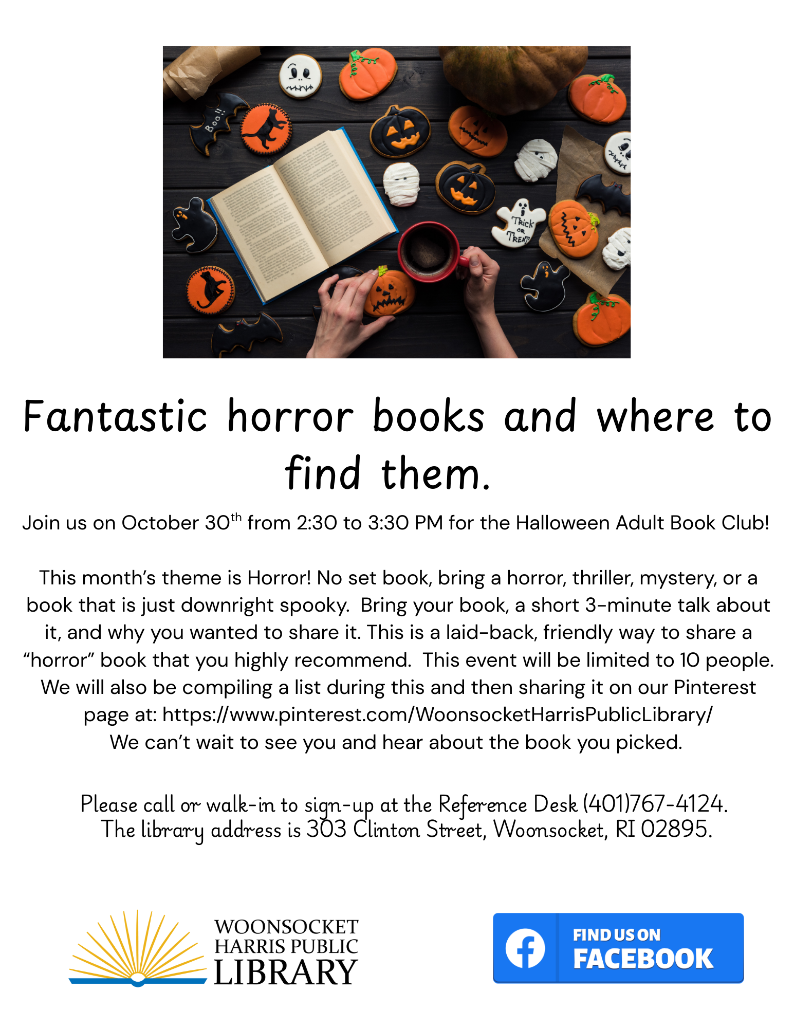 Join us on October 30th from 2:30 to 3:30 PM for the Halloween Adult Book Club!