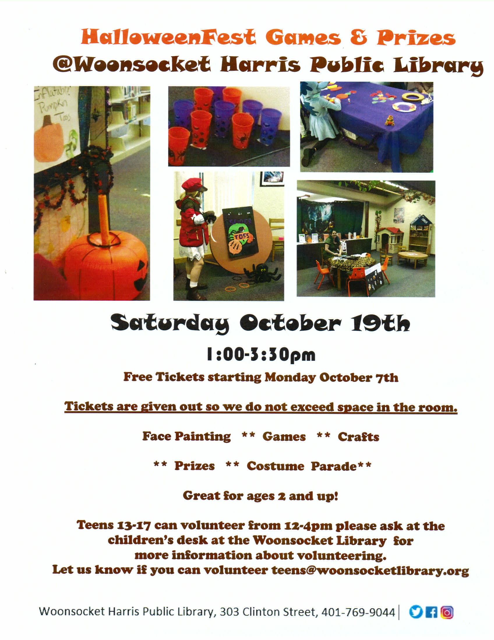 Teen Volunteers wanted to be at game stations. 13-17 years. Volunteers should report between 12 noon and 12:30 to go over the rules and get pizza and water and be assigned game stations. Volunteer time 12-4:30pm Community service credit for school is given. Call 401-769-9044 x2