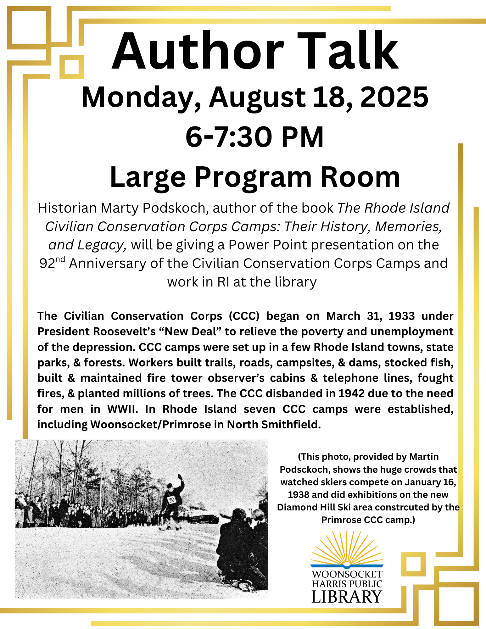 Historian Marty Podskoch, author of the book The Rhode Island Civilian Conservation Corps Camps: Their History, Memories, and Legacy, will be giving a Power Point presentation on the 92nd Anniversary of the Civilian Conservation Corps Camps and work in RI at the library.