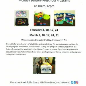 Every Monday Linda Brunetti from The Autism Project is here at a table in the children’s room preschool area to talk with parents about services Autism Project provides. Feel free to stop at the table and say hello. During her visit we will open the children’s program room for a sensory exploration play where parents and kids can play with toys that develop fine and gross motor skills. Toys are geared to the preschool age.